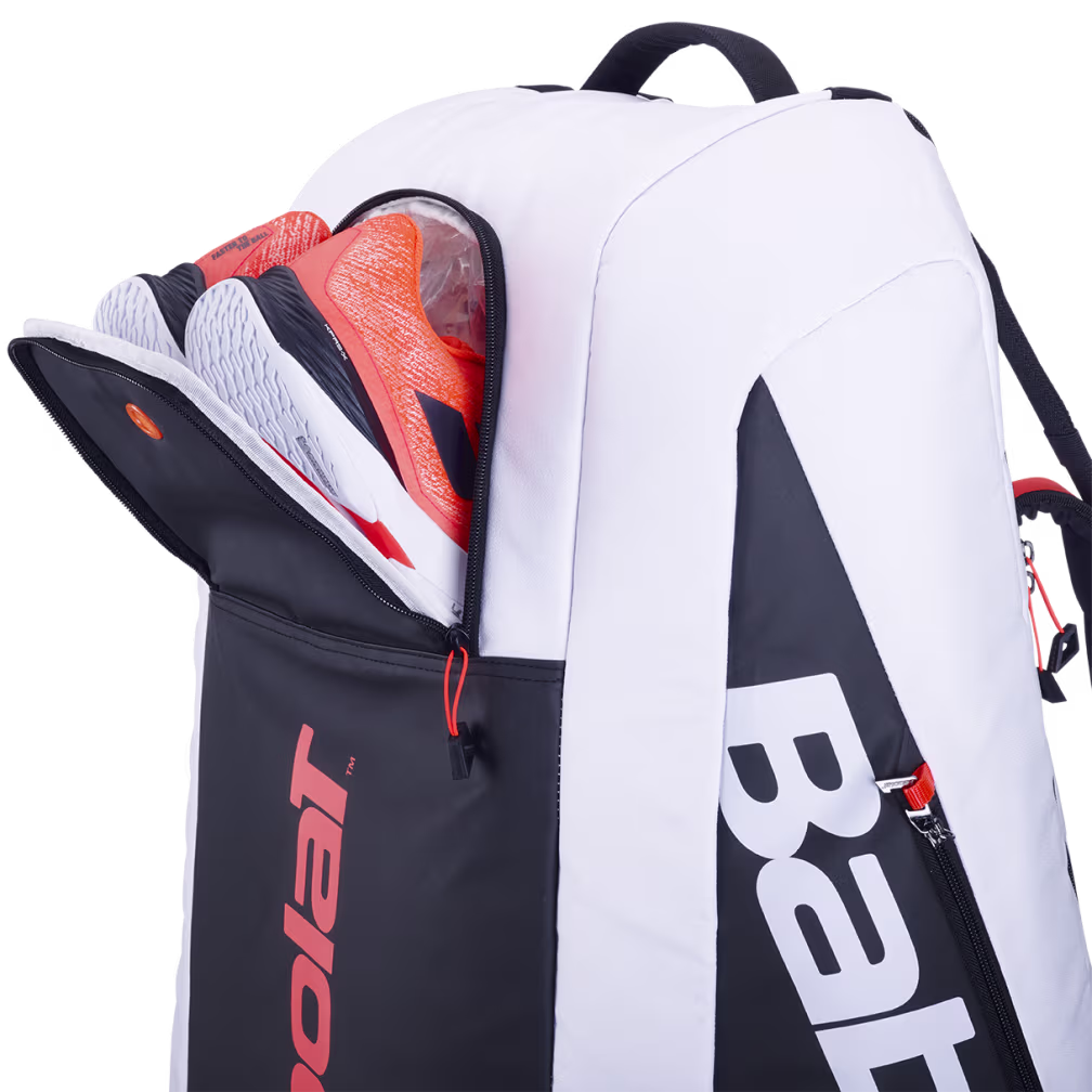 También puedes guardar fácilmente hasta 2 pares de zapatos en el compartimento ventilado independiente. Esta bolsa para raquetas, más cómoda, tiene un nuevo sistema de transporte con recordatorio de carga y correas exclusivas que estabilizan la bolsa en la espalda (acercándola a tu centro de gravedad).