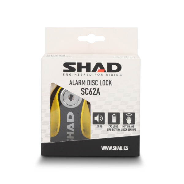 El antirrobo de disco SC62A dispone de una alarma integrada de 120dB con sensores de choque y movimiento, alimentada por una batería CR2 de litio y con opción on/off.