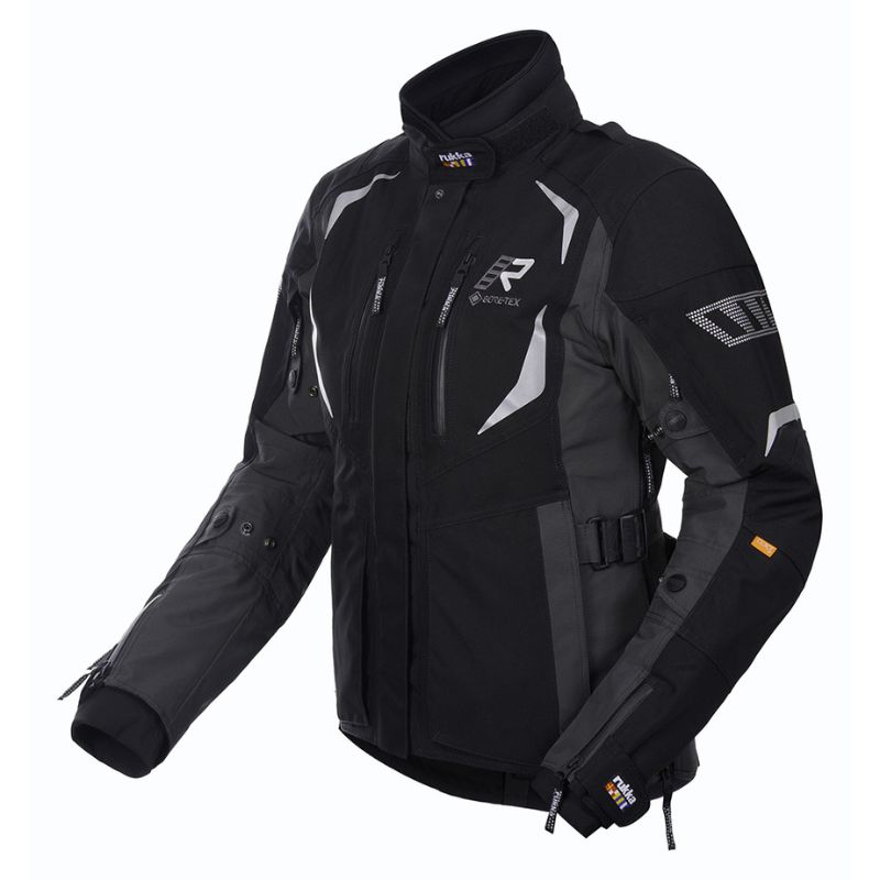 Chaqueta de moto Rukka Adventure para mujer. Neopreno suave en el cuello. Cuello GORE-TEX Stretch protector integrado ATS (=attached storm collar), que se puede ocultar en su bolsillo. Inserciones elásticas en la parte superior de la espalda. Puños con cremalleras y puños interiores impermeables. Correas en los hombros y trabillas elásticas en la parte posterior de la chaqueta para la instalación de una bolsa de agua. Ajuste de ancho en la parte superior e inferior del brazo con botones a presión. Dobladillo y puños ajustables con velcro. Correa de entrepierna y cremallera de conexión larga para pantalones. Cinturón ajustable en los laterales. Refuerzos CORDURA® 500D resistentes a la abrasión en hombros y codos. Tejido exterior de poliéster GORE-TEX de 2 capas laminado, 100 % transpirable, resistente al viento y al agua, resistente a la abrasión y al desgarro. Dos bolsillos inferiores resistentes al agua con cremallera. Bolsillo grande en la parte inferior de la espalda compatible con una bolsa de agua de 1,5 L. Bolsillo interior para documentos resistente al agua.