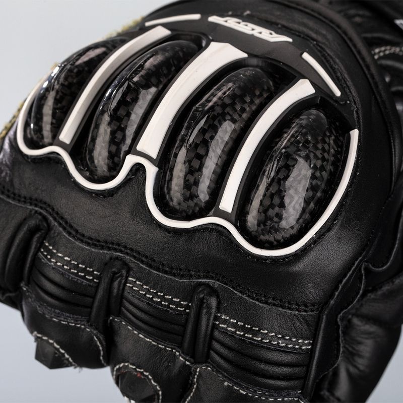 Fabricado tanto con piel de vacuno plena flor como con piel de canguro, el guante incorpora un Protector de Nudillos de Carbono CE Nivel 1 para protección contra impactos. La fibra de aramida en las costuras y el interior de la palma, junto con la piel de canguro de doble capa y un deslizador RST en la palma, protegen la palma en caso de deslizamiento a alta velocidad, mientras que el doble cierre de la muñeca y el puño ofrecen un ajuste seguro. El forro reforzado con aramida en el resto del guante evita desgarros, y los dedos elásticos unidos evitan el «enrollamiento de los dedos» sin afectar al alcance ni a la flexibilidad al cambiar de marcha.