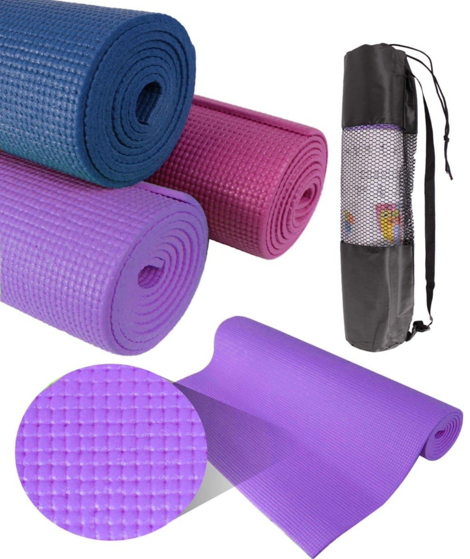 Mat o colchoneta de yoga marca Wonder Sports con suelo antideslizante y funda en tela para transportarla a tus rutinas al aire libre o caminatas