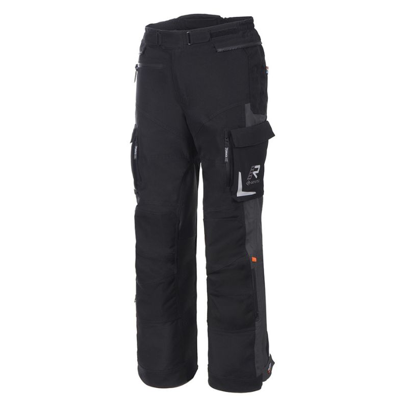 Pantalones de moto Rukka Adventure para hombre. Sistema Rukka AirCushion en la zona del asiento. Parches de cuero resistentes al calor y a la abrasión en la parte interior de las rodillas y en la zona del asiento. Paneles elásticos en el canesú trasero. Cierre de cintura con doble ajuste. Cremallera de conexión para chaqueta. Bajos de pierna ajustables con cremalleras y velcro. Se puede equipar con tirantes Rukka Defence & Comfort. Refuerzos CORDURA® 500D resistentes a la abrasión en caderas y rodillas. Tejido exterior de poliéster GORE-TEX de 2 capas laminado resistente al desgarro y a la abrasión, 100 % transpirable, resistente al viento y al agua. Un bolsillo exterior con cremallera. Dos bolsillos cargo resistentes al agua con cremalleras y cierres de velcro.